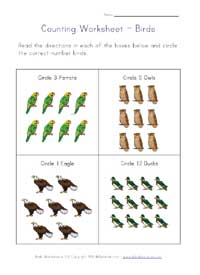 How many birds? - Free Counting Worksheet - Student Handouts This free printable worksheet has kids count birds. Each row displays a number of birds between one and ten. In the box to the right, the student writes down the corresponding number. Click here to print. Click here for more of our free kindergarten worksheets. CCSS.MATH.CONTENT.K.CC.B.5 - Count to answer "how many?"